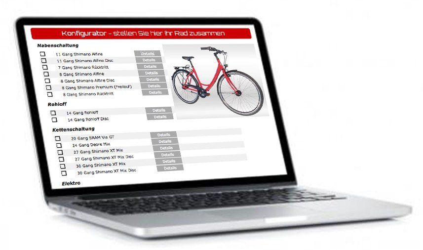 Ein individuell zusammengestelltes Fahrrad macht das Radfahren zu einem ganz besonderen Vergnügen. Die richtige Wahl erfordert jedoch fundiertes Fachwissen zu den vielfältigen Komponenten. Gerne konfigurieren wir gemeinsam mit Ihnen "Ihr" perfektes Rad.